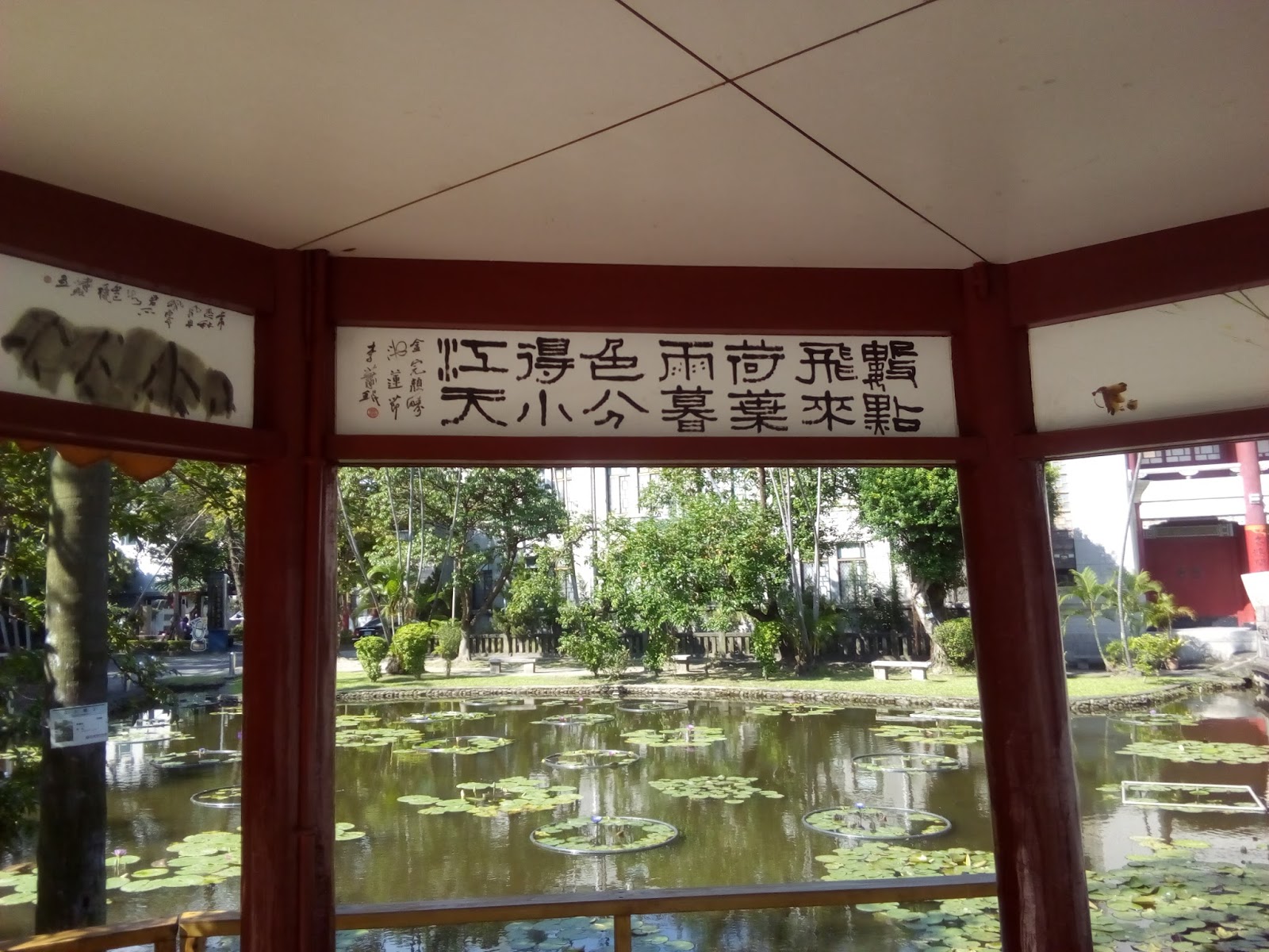 到台北植物園的涼亭,欣賞著周遭的美景,盛開的荷花,除了攝影、吃水果,喝飲料,我們還可以一起詠荷。與古人一起仰天地之悠悠,法古今完人,與賈寶玉、林黛玉、、、一起吟詩作樂。不過雖然有許多古籍經典作範本,有畫抄幫忙提醒,要念出整句,玩一玩後花園的瀟灑,沒背兩句也玩不起來的。
