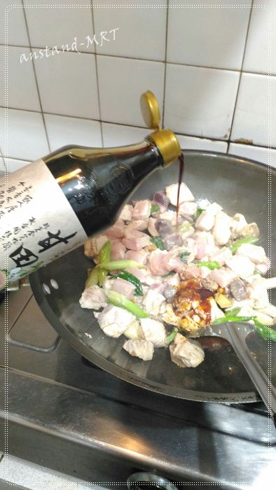 然後將鯊魚肉塊、大蔥放入鍋中翻炒,