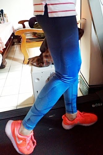 這一、兩年來才開始有要運動的念頭,一開始是先上瑜伽課,穿著就只是舒服的運動褲而已,但每次上課看著瑜伽老師的繽紛緊身褲又蠻羨慕的,因為我不敢穿著這麼花花綠綠的緊身褲搭捷運。今年年初開始在跑步機上快走,那時還蠻冷的,因為動了後會狂流汗,再加上又是在家中所以服裝就是以短褲、短袖為主,老媽看了都快昏了,說哪有人冬天還在穿短褲運動?她不知道我很流汗,不喜歡腹部以下悶住不透氣的感覺。到了近幾個月才開始較強力的運動,這時褲子的穿著就會較仔細的挑選,家中也有幾件壓力褲,但在家做自主訓練好像也用不到壓力褲,這時候就該挑選件舒服的緊身褲。