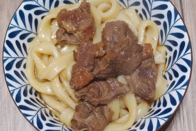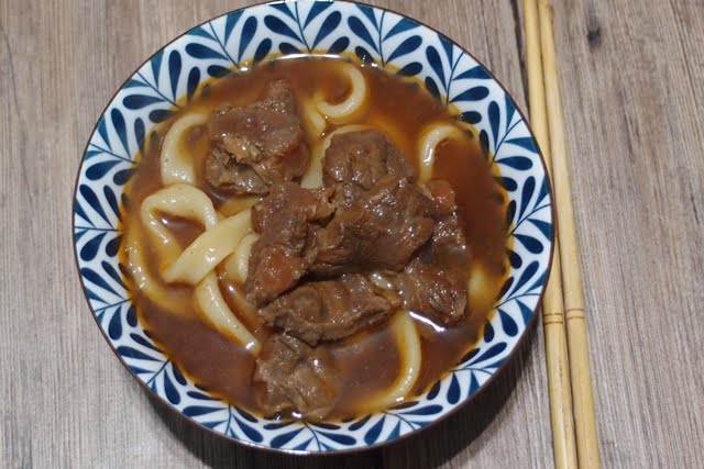 這道牛肉麵忘了先試未加辣包前的味道,起鍋時就直接拌入辣包,聞起來有花椒的香氣,整體品嚐的口感就有一點點鹹、花椒的椒麻味。而一包湯包500g、南僑半熟麵200g,和家人一人一半分食。
