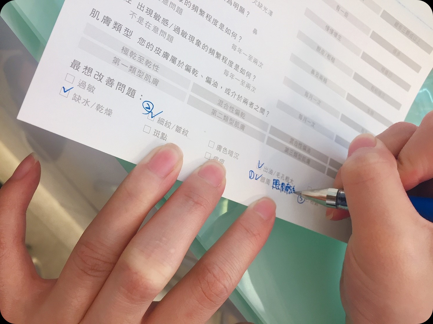 填了以下的問券了解自已對於肌膚最在乎的地方與狀況是什麼。